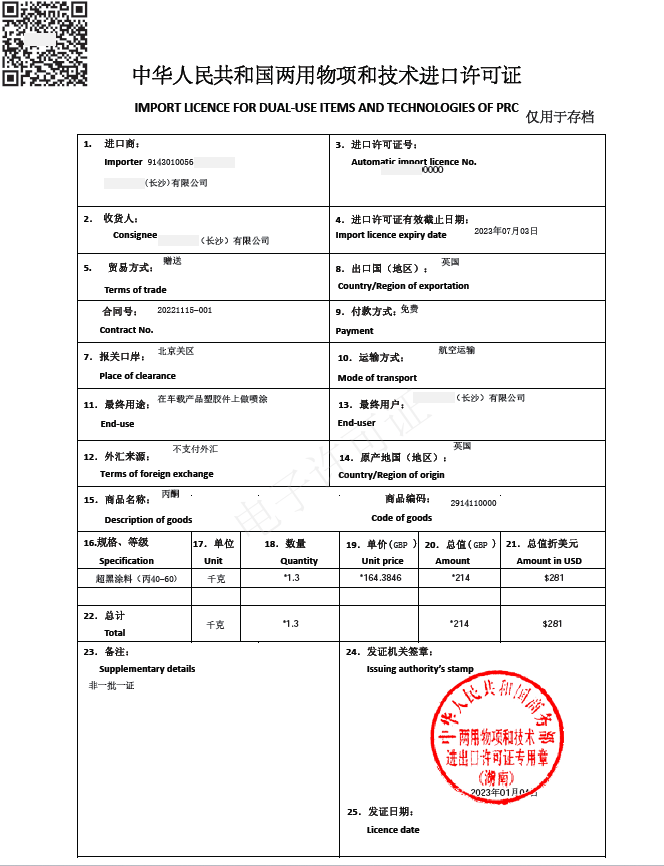中華人民共和國兩用物項(xiàng)和技術(shù)進(jìn)口許可證(樣例)
