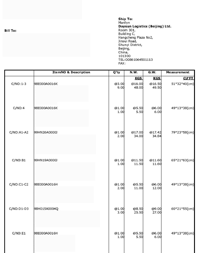 空運(yùn)、海運(yùn)、快件-箱單(樣例)