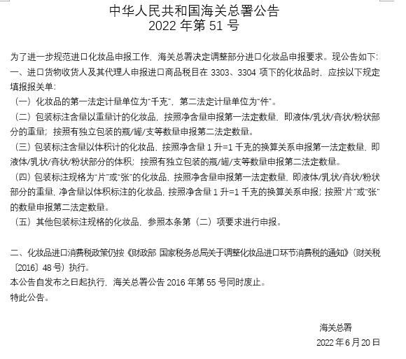 海關(guān)總署公告2022年第51號(hào) (關(guān)于調(diào)整部分進(jìn)口化妝品申報(bào)要求的公告)