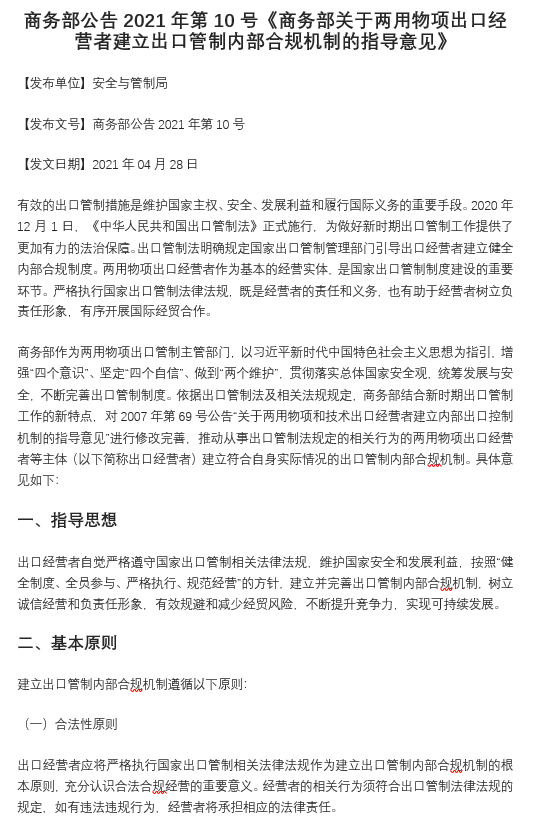 商務(wù)部公告2021年第10號《商務(wù)部關(guān)于兩用物項(xiàng)出口經(jīng)營者建立出口管制內(nèi)部合規(guī)機(jī)制的指導(dǎo)意見》