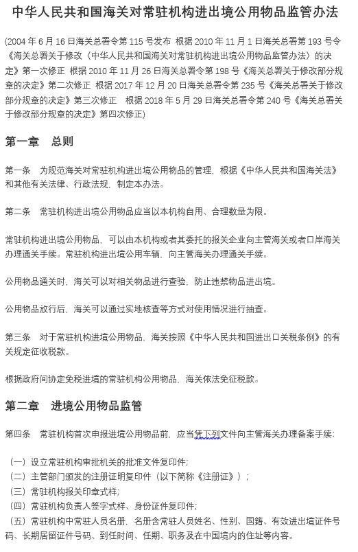 中華人民共和國(guó)海關(guān)對(duì)常駐機(jī)構(gòu)進(jìn)出境公用物品監(jiān)管辦法