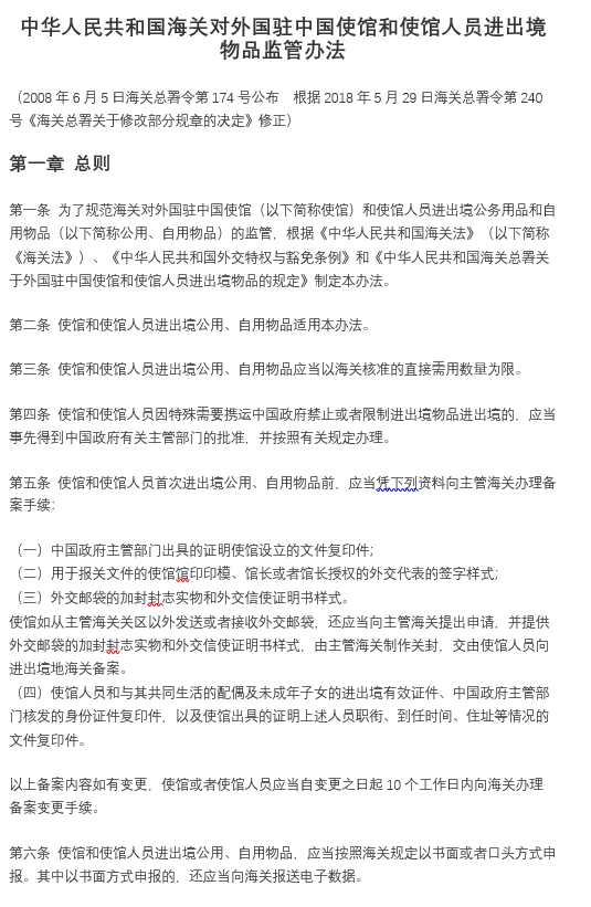 中華人民共和國海關(guān)對外國駐中國使館和使館人員進(jìn)出境物品監(jiān)管辦法