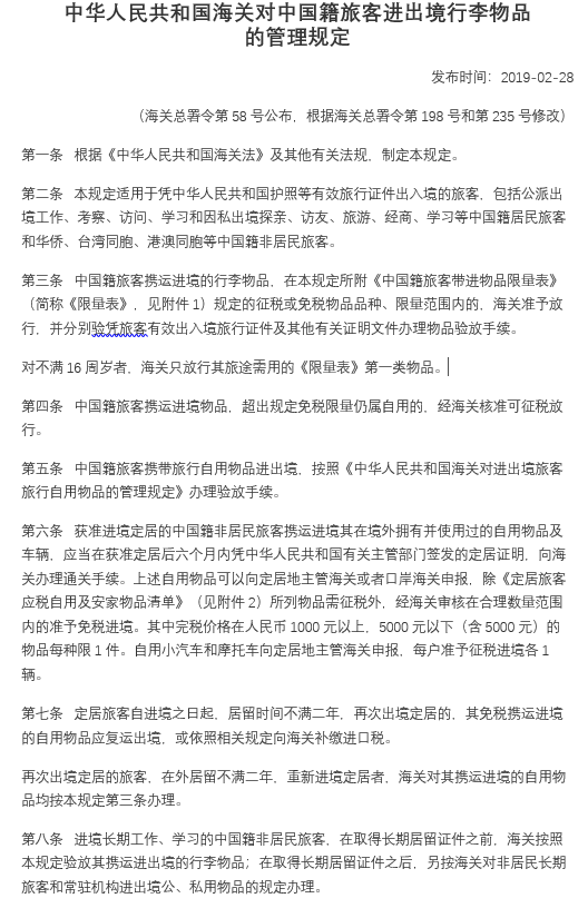 中華人民共和國海關(guān)對中國籍旅客進出境行李物品 的管理規(guī)定
