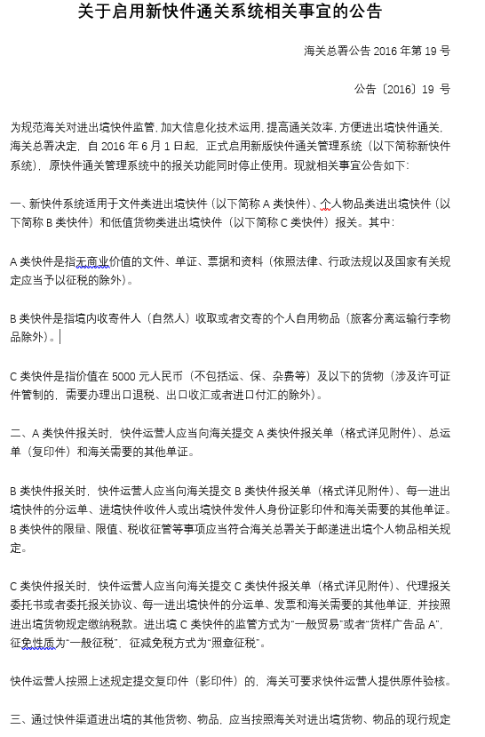 關于啟用新快件通關系統(tǒng)相關事宜的公告