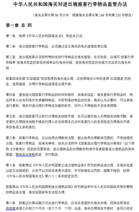 中華人民共和國海關(guān)對進(jìn)出境旅客行李物品監(jiān)管辦法