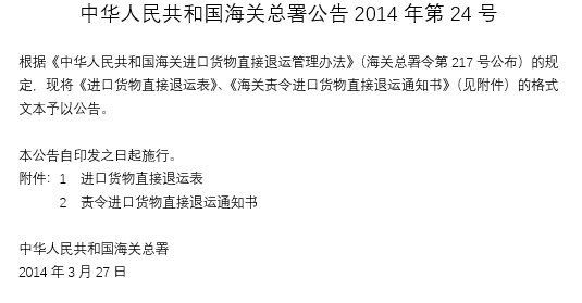 海關(guān)總署公告2014年第24號(關(guān)于執(zhí)行中華人民共和國海關(guān)進口貨物直接退運管理辦法有關(guān)問題的公告)