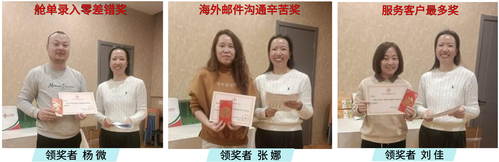 馬健副總經(jīng)理在匯報完各部門的工作后,特為表現(xiàn)出眾的員工頒發(fā)獎項。楊微憑借精湛的業(yè)務能力和高度的責任心,確保監(jiān)管庫一年上萬票艙單信息錄入零差錯,榮獲 “艙單錄入零差錯獎”;因業(yè)務性質(zhì),張娜時常在下班到家后,克服于海外時差等原因,積極回應海外代理發(fā)來的郵件,榮獲“海外郵件溝通辛苦獎”;劉佳憑借出色的溝通能力和服務意識,成功服務百余個客戶,在應對客戶需求時始終保持專業(yè)、耐心和穩(wěn)定的情緒,榮獲“服務客戶最多獎”。